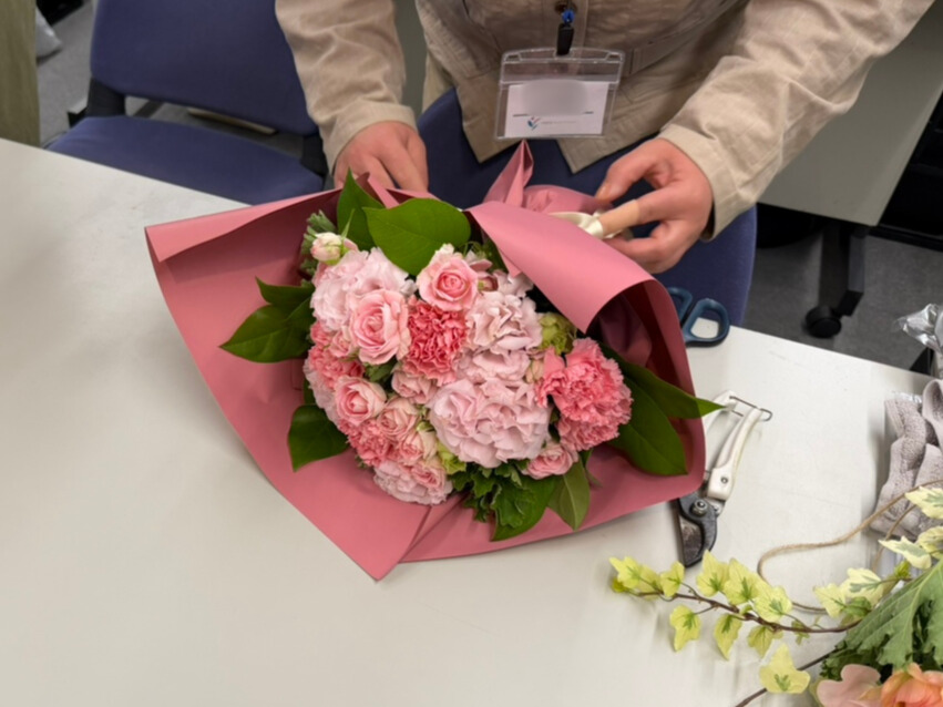 同じ花材でも、組み方や色のバランス、仕上げ方の工夫によって印象が大きく変わることを体感し、トレンド感のあるふんわりとした花束を作るポイントを学ぶことができました。