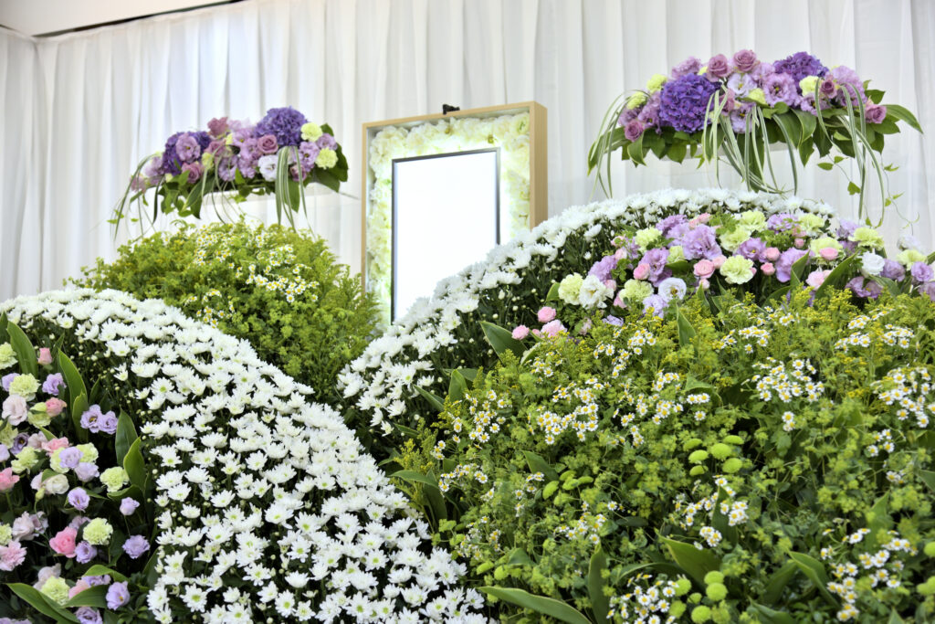 • 設営・製作: 祭壇を彩る「生花祭壇」の作成。数千本の花をミリ単位で生けていく職人技