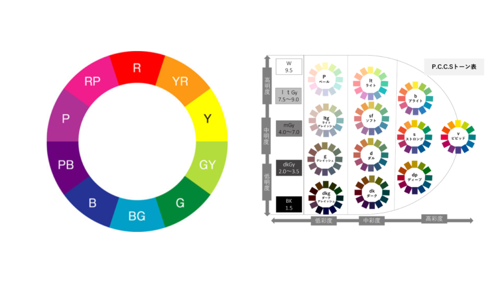 マンセルは「色の客観的数値化」、PCCSは「色相とトーン(明度と彩度の複合)による感情効果」を