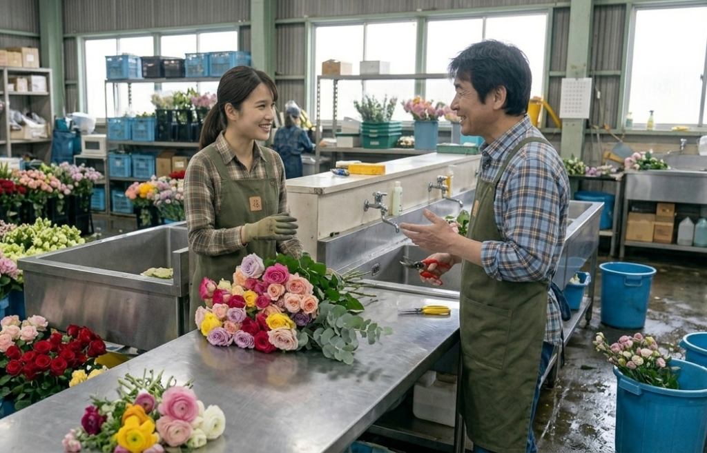 たとえば、花材の仕分けや下処理、長さを整える作業、状態の確認、梱包に向けた準備など、さまざまな工程があります。これらの作業を誰か一人が全部やるのではなく、工程ごとに役割を分けて、みんなで協力しながら進めていく現場でした!